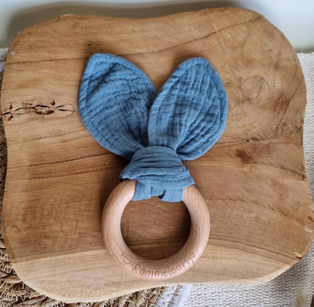 Deze houten bijtring met zachte konijnenoren is perfect om mee te knuffelen en op te tutten. De konijnenoren zijn gemaakt van zachte hydrofiele stof in rustige, neutrale aardetinten. Een lief en fijn doekje voor je baby om vast te houden en comfort te vinden.