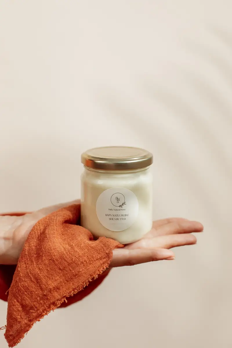 Shea butter is een 100% natuurlijke vochtinbrenger voor de huid van moeder en baby, zonder chemische ingrediënten.